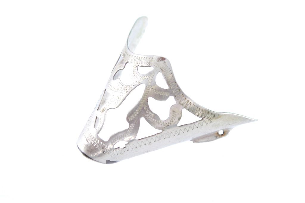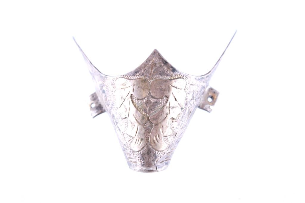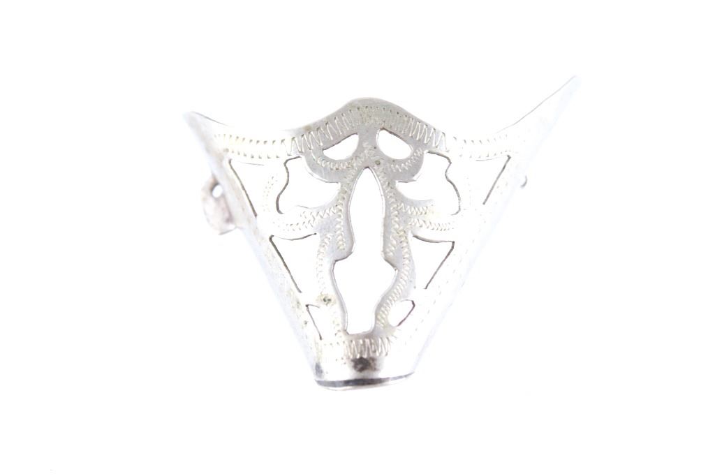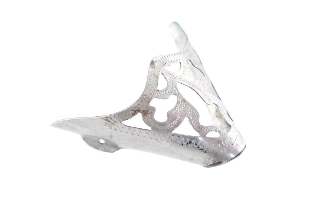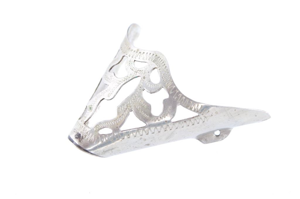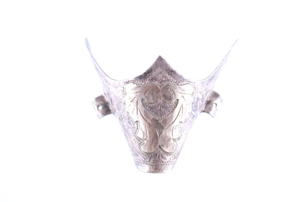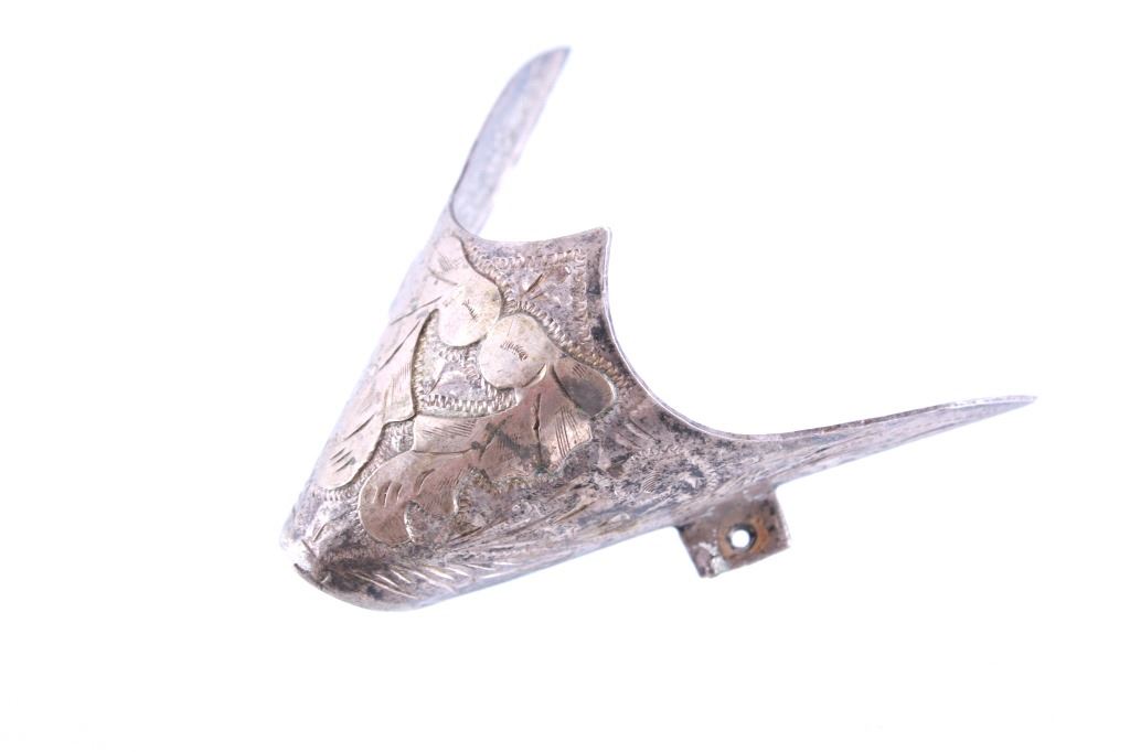 Featured in this lot is this Mexican Vaquero cowboy silver boot tips circa 1930's. There are two sets of boot tips in this collection. The first pair are beautifully tooled with floral decoration and crafted from .925 and from Platade Jalisco and is marked on the underside of the boot tips. The second pair is tooled and framed with western decoration and constructed from silver and has been chemically tested. The condition of this collection of boot tips is good with a slight patina consistent with the age of the boot tips and in good overall condition. The measurements of the boot tips are 1" x 2 1/2" x 1" and 2" x 2 1/4" x 1". The collective weight of the boot tips are 47.5g