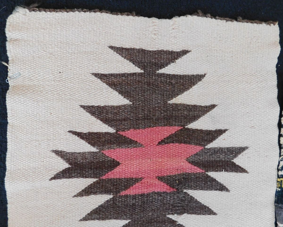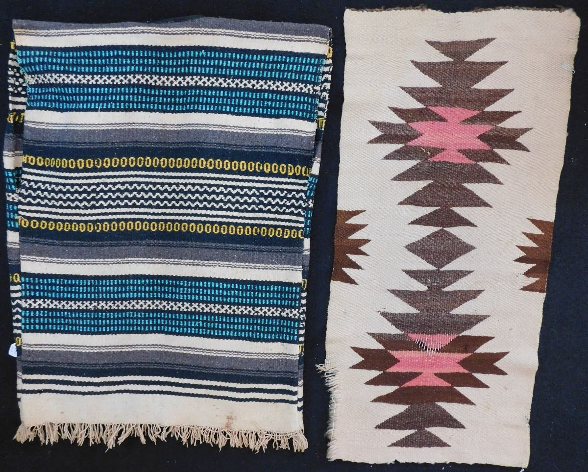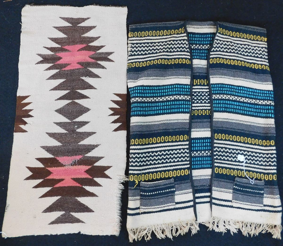 Mexican Vest Weaving & Navajo Weaving, circa 1950s. Made of wool and cotton, the vest measures 32" x 22" and the rug measures 35" x 18". From Mexico and New Mexico. Vest is a medium size. Condition: Rug is worn and damaged, vest is in good shape, see images. Shipping: $24.50.