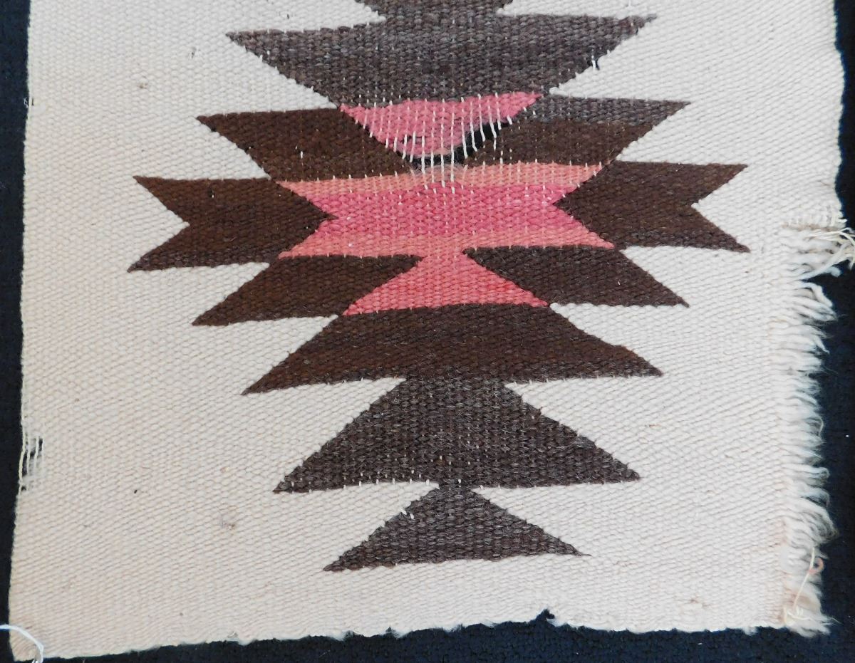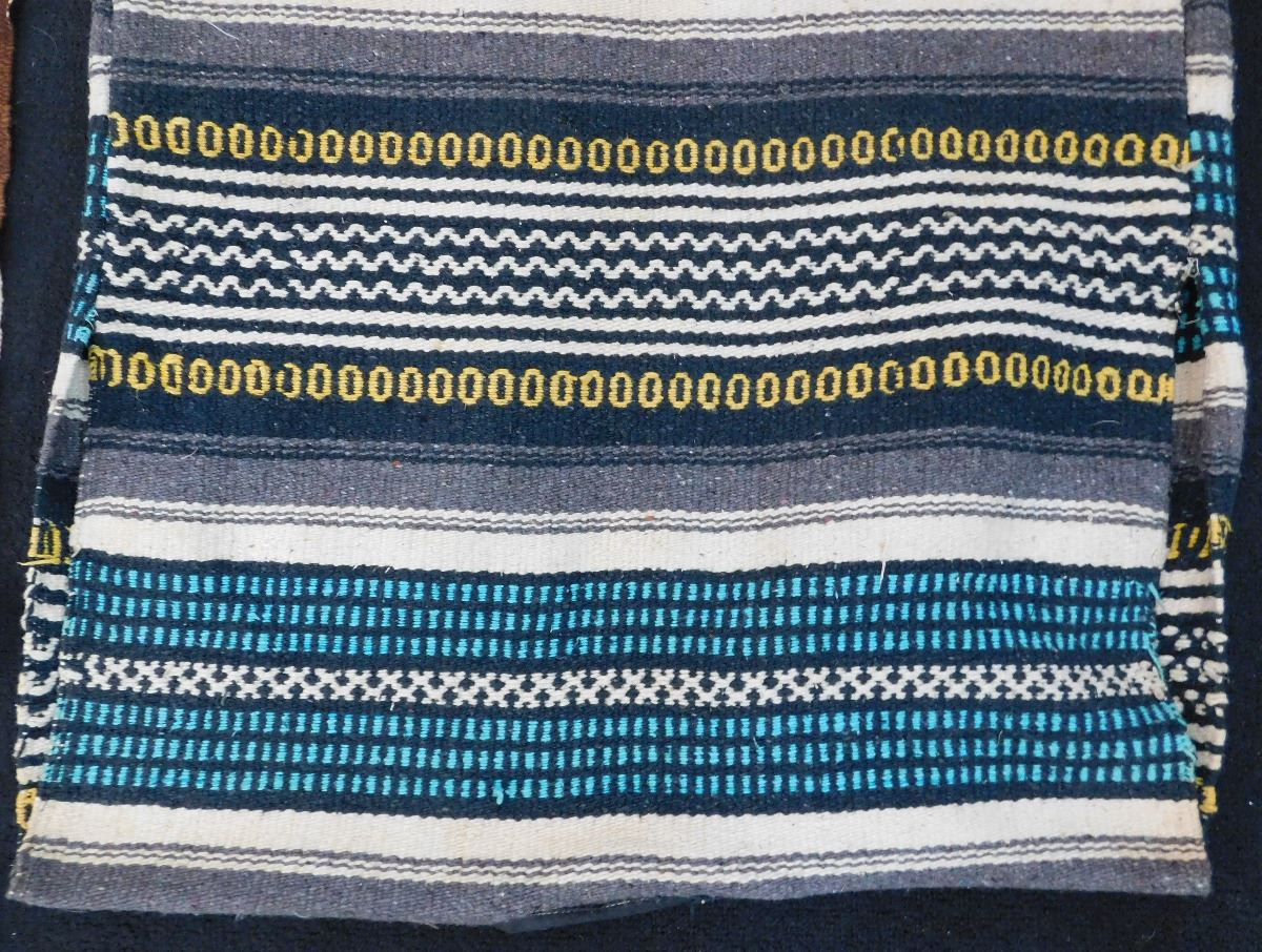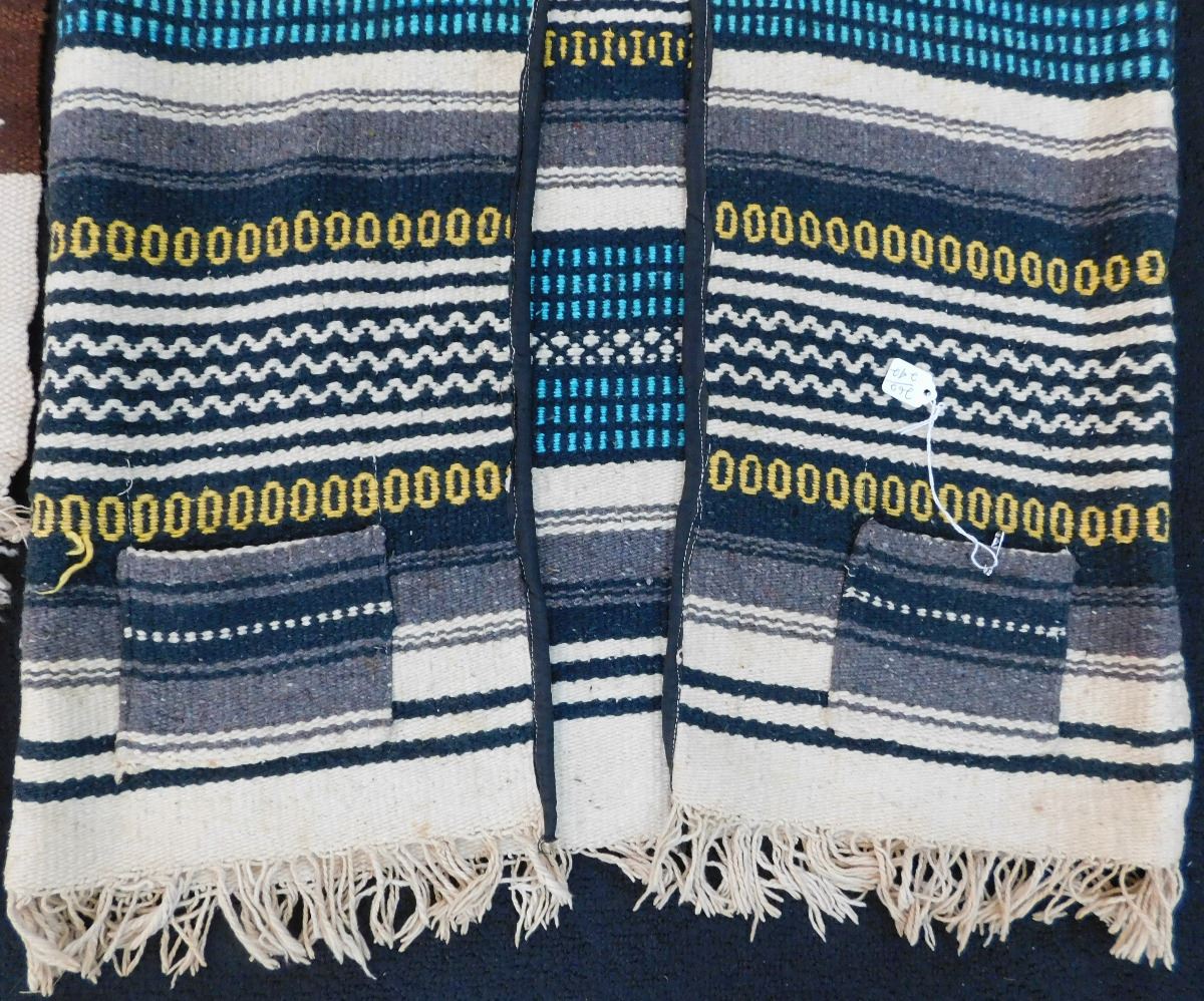 Mexican Vest Weaving & Navajo Weaving, circa 1950s. Made of wool and cotton, the vest measures 32" x 22" and the rug measures 35" x 18". From Mexico and New Mexico. Vest is a medium size. Condition: Rug is worn and damaged, vest is in good shape, see images. Shipping: $24.50.