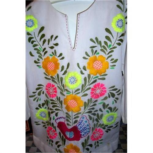 Typically beautifull Mexican shirt, hand embroidered, with lovely bright flowers, leaves. I never get tired of seeing these folk art pieces from Mexico. Made by Mexican designer Mal (Bad) this shirt measures 24 inches from neck to hem, 42 inches around, from armpit to armpit, and the three quarter length sleeve inseam is 12, inches.In very good condition, no stains, no tears, no loss of embroidery that I can see. Thank You for shopping in the Land of Enchantment!