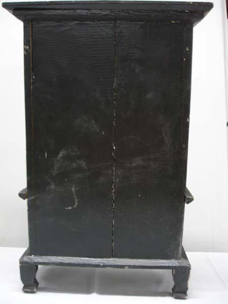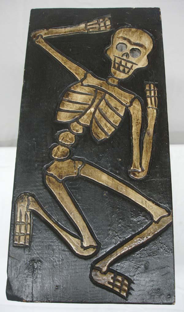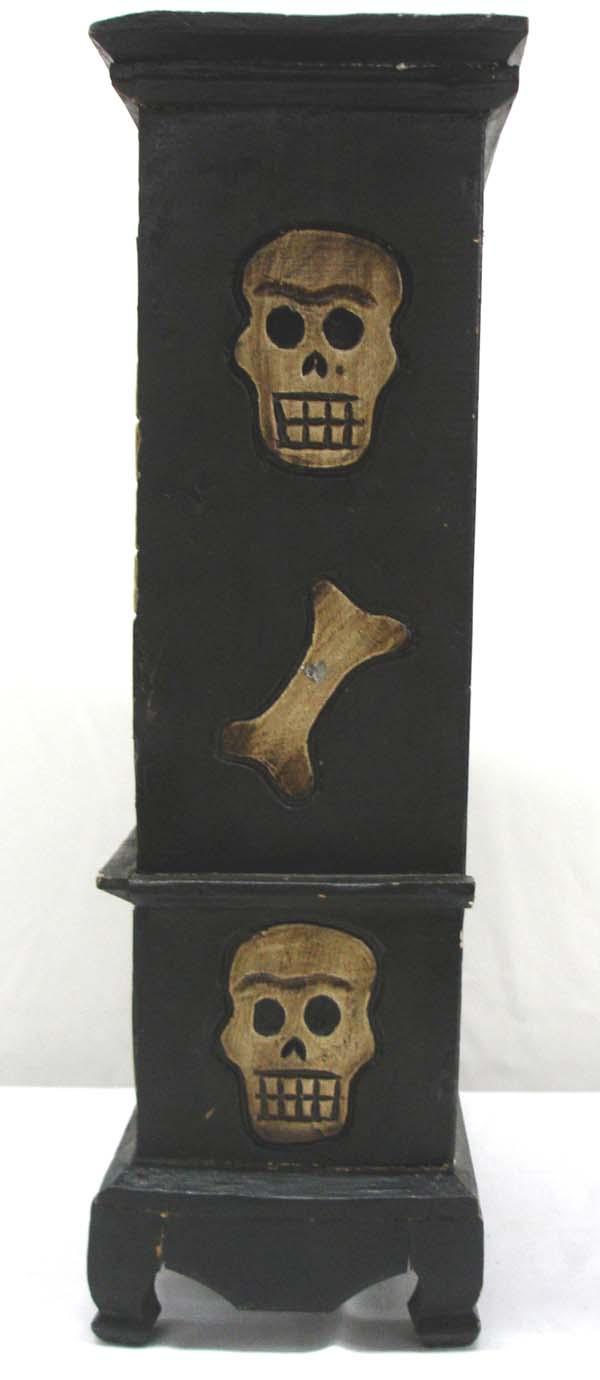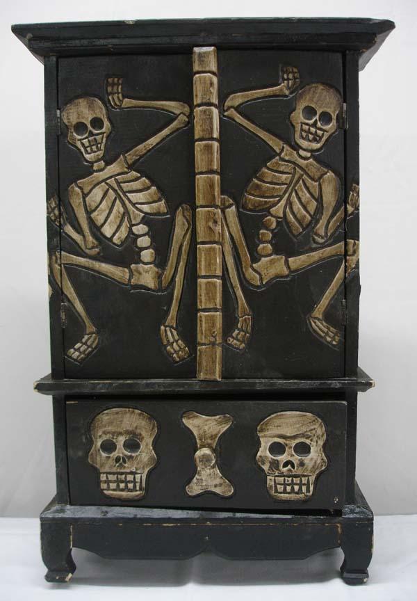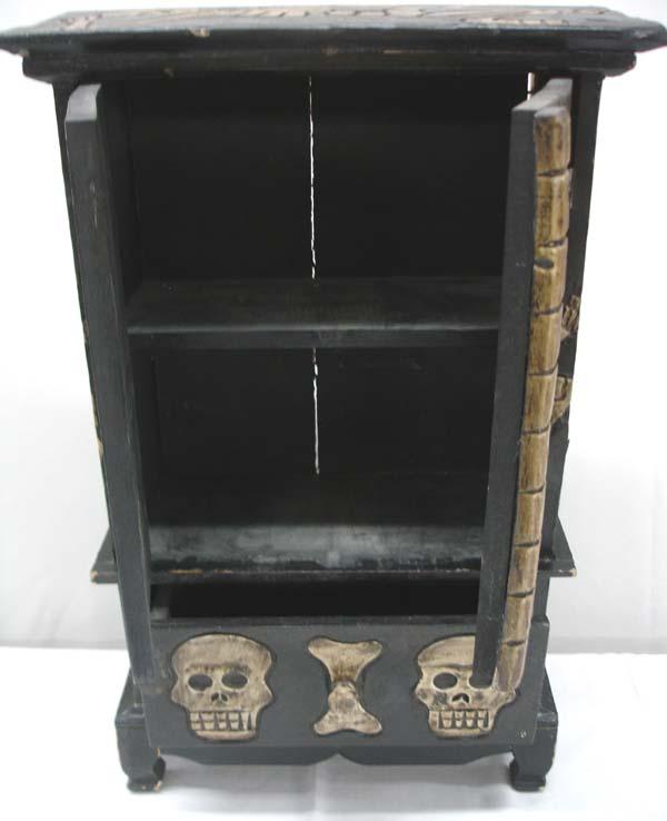 Mexican Wooden Cabinet, Day of the Dead Theme.23'' H x 14'' L x 7'' deep. One pull out drawer. Two inside shelves. A crack on the back side. Black and antiqued finish on skeletons. Buyers Pay Actual Shipping and Handling Charges(see terms and conditions for more information).