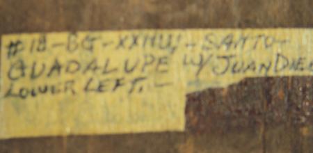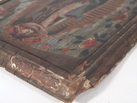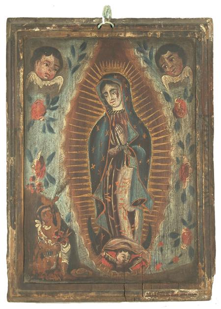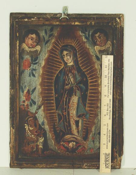 Traditional hand carved and painted religious panel depicting the Virgin Guadalupe, Juan Diego, and other figures. Condition: good. 16" x 12"