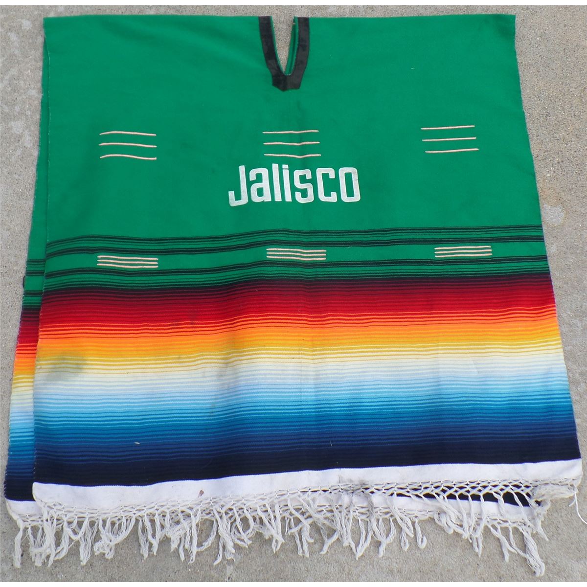 Mexican Wool Poncho, circa 1960s. Made of wool, possibly suede fabric around neckhole. Measures 39" x 35" as worn. Mexican, from Guadalajara, Jalisco. Has stains on front and back but still is a beautiful multi-colored poncho. Condition: May need cleaning, see images. Shipping; $14.50