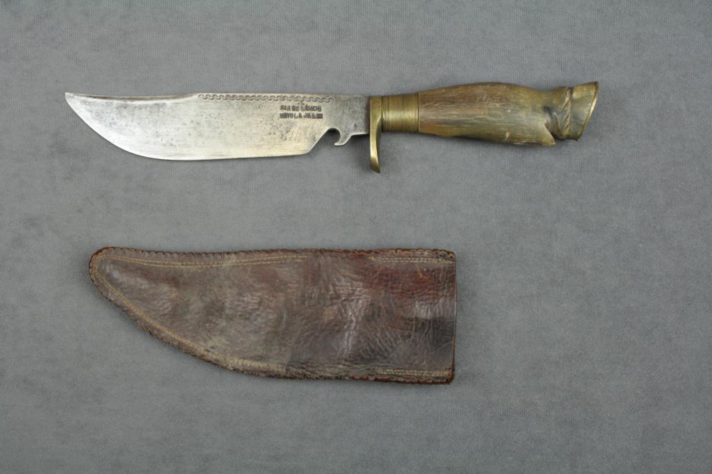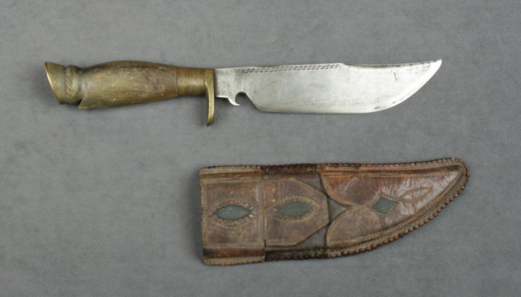 Mexican belt knife and leather sheath approx. 12” overall with an approx. 7” semi-clip point blade with brass mountings and horn grip. The knife is in overall very good condition with slight engraving and stamped“Elias Lakios, Savula Jal”; horn grip is carved in the shap of a hoof with a brass horseshoe as the pommel cap. The scabbard is nicely accomplished and in overall very good condition. Est.: $100-$250.