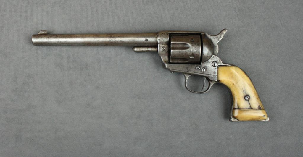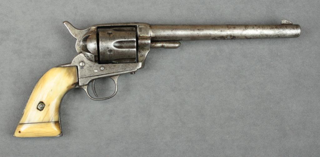 Mexican copy of a Colt SAA, .44 cal., 7-1/2” barrel, grey patina, old bone grips, #NVSN. This gun is in classic “south of the border” appearance showing a grey patina on metal surfaces with scattered areas of erosion,good action, fair bore; bone grips are worn and show added bases to each grip giving the grips an added dimension of character. Est.: $250-$500.