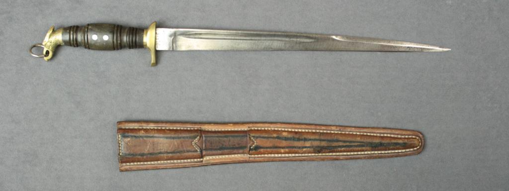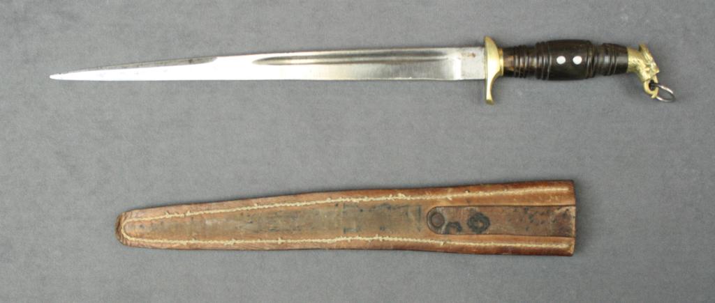Mexican long dagger and leather sheath approx. 16” overall with an approx. 12” blade with blood groove and hand engraved “PLEPE” with an arrow carved under the name on the right side of the blade at the hilt. Thispiece is in overall good condition showing a nice blade with a couple spots of erosion and pitting on the left side of the blade, brass guard, carved horn grip and brass eagle head pommel; the sheath is in overall goodcondition with some scuffing and wear and some lightly inked letters on the front and back; good stitching. Est.: $100-$250.