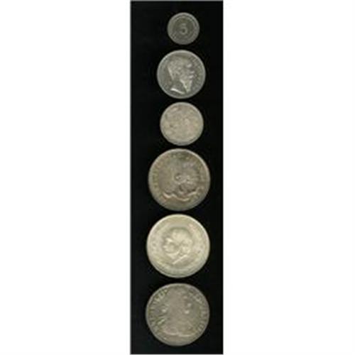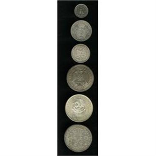 <B>Mexican madness!</B></I> Ferdinand VII portrait 8 Reales 1810-Mo HJ, About XF and nice; Maximillian 50 Centavos 1866-Mo, VF-XF, bright; 5 Centavos 1912-M, XF; 50 Centavos 1919-M, XF; Guerrero revolutionary 2 Pesos 1914, AU and sharp, a scuff on the eagle's wing; 5 Pesos silver Hidalgo 1954-Mo, satiny BU (rare date: 30,000 struck). A lot of interesting pieces.<BR><I>From the Monedas Oro Collection</B></I><BR><BR><b>Shipping:</b> Coin/Currency (<a target="_blank" href="http://www.heritageauctions.com/common/shipping.php">view shipping information</a>)