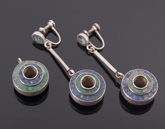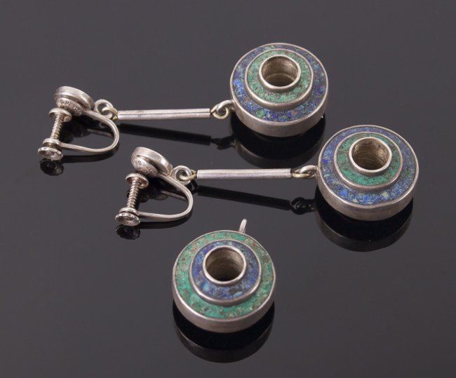 Mexican sterling silver crushed turquoise and lapis lazuli pendant and earring set. SIZE: see attached ruler photo. Photos are part of the description representing the condition report and can be used for authentication prior to the sale date. Pangaea Auctions urges Bidder's to view all attached photos in detail. #(Native American, 19th-20th Century, Jewelry, Earring, 925 Sterling Silver, Turquoise, Pendant, ).