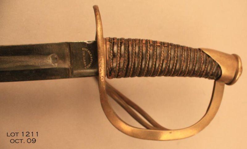 Mexican sword and leather scabbard approx. 32” overall, blade is marked “A C Mexico” and shows the starburst hat (both at the hilt of the blade) and is of heavy construction showing a pleasing dark patina; the leather scabbard retains itsoriginal brass throat and tip and carry ring; in overall good condition with grip wire wrap remaining but some loss to the leather covering of the wood grip. Nice patina to brass hand guard. Est.: $300-$600.