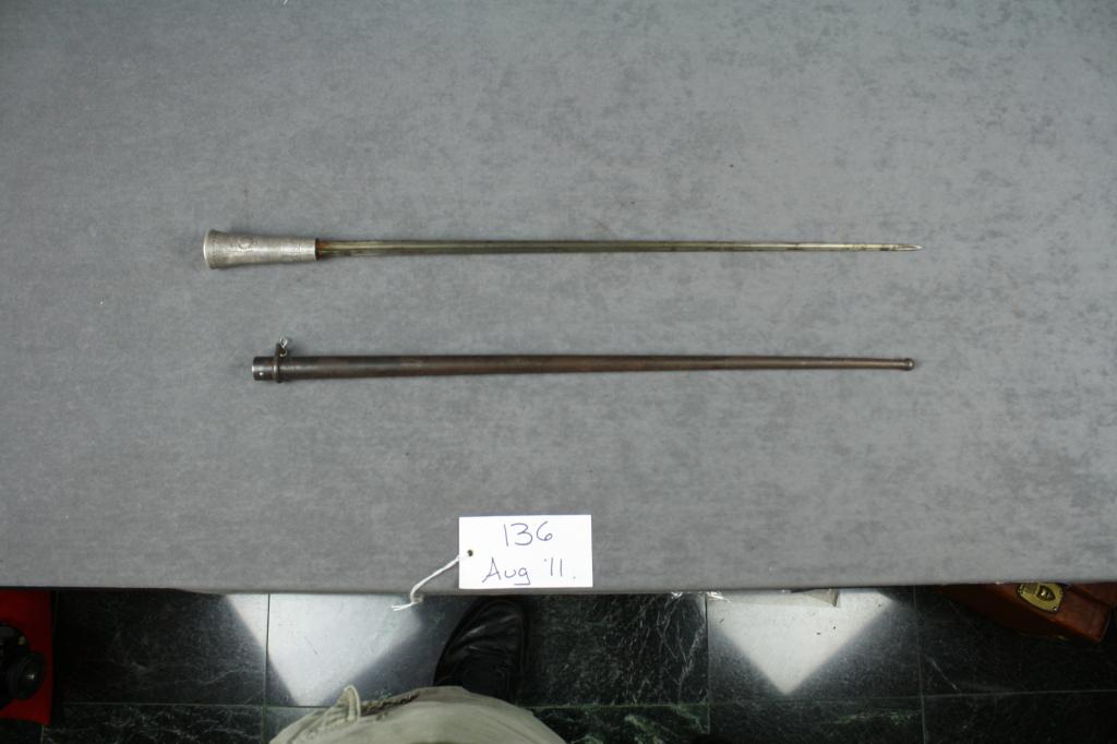 Mexican tri-bayonet contained in a metal  scabbard with a beautifully-engraved silver  handle approx. 25” overall. The blade is in  overall very good uncleaned condition, dark  patina on scabbard and very detailedengraving on the handle including florals and  geometric designs with a horse head engraved  on the pommel of the handle.   Est.:   $250-$500.