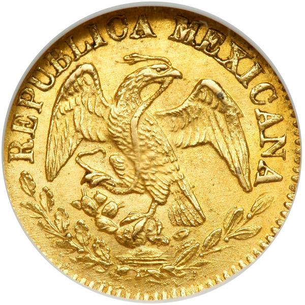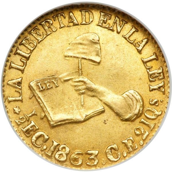 Mexico. ½ Escudo, 1863-C CE. Fr-109; KM-378. Hand on book. Bold strike with lots of luster. Scarce this nice. NGC graded MS-64.