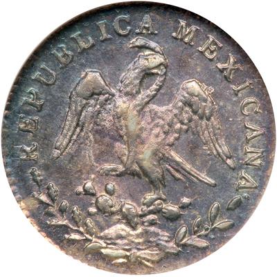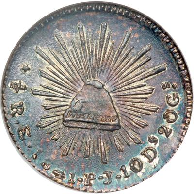 Mexico. ½ Real, 1841-Go PJ. KM-370.7. Republic. Cap and rays. Highly lustrous with deep blue iridescent toning. NGC graded MS-65.