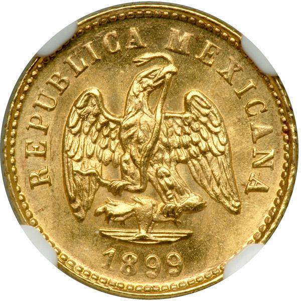 Mexico. 1 Peso, 1899-Mo M. Fr-157; KM-410.5. Eagle. Reverse: Value. Mintage 9,515. Sharply struck with lovely original mint fresh luster. Scarce this nice. NGC graded MS-65.