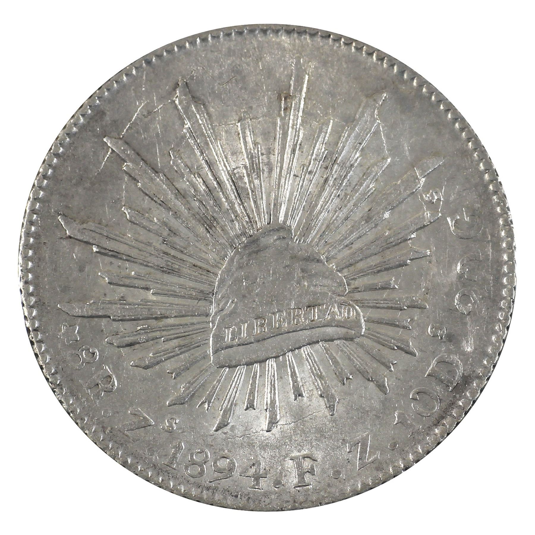 Mexico 1894 ZS FZ 8 Reales (Zacatecas) in BU Condition. Bright coin with several die cracks and anomalies throughout.