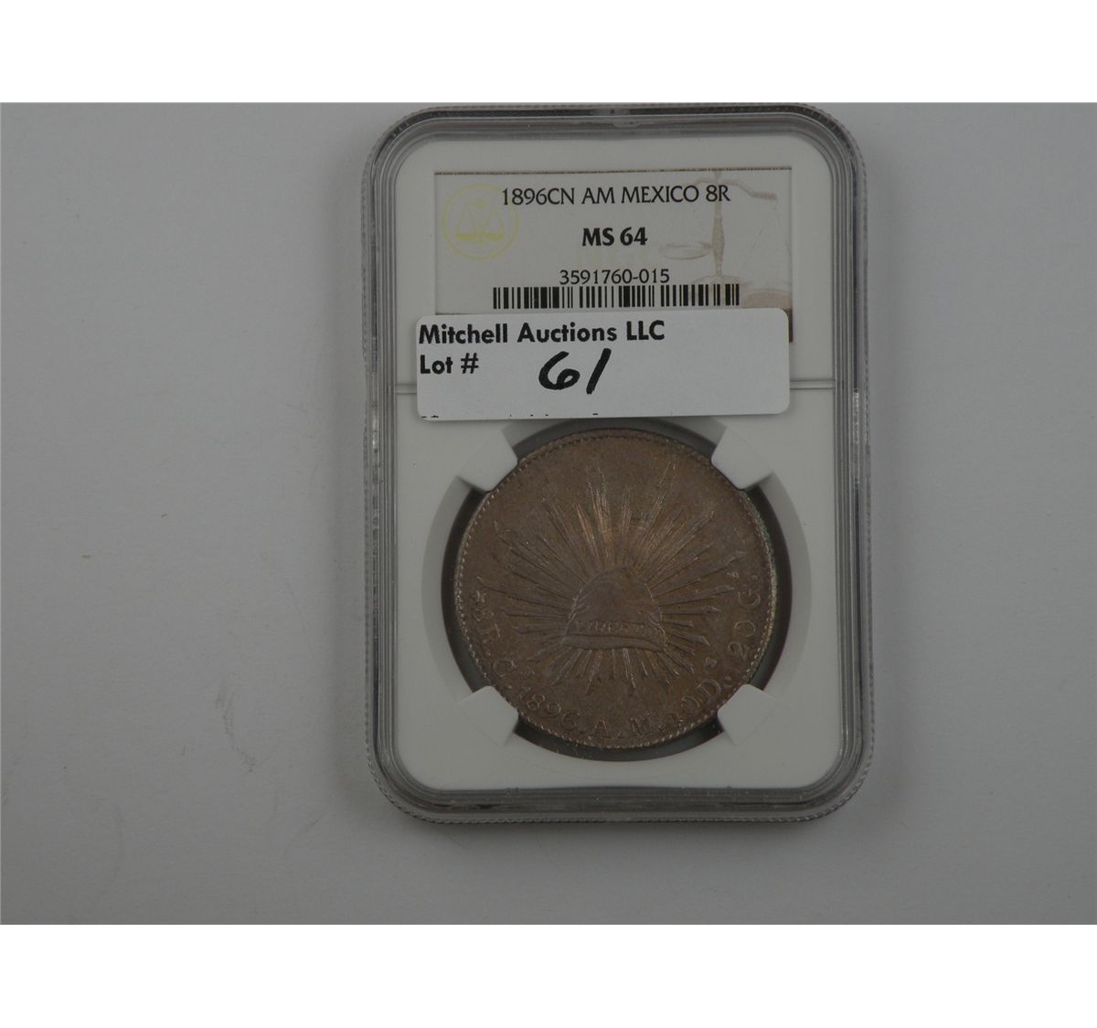 Mexico 1896 Cn AM. 8Reales. Culiacan Mint. NGC MS64 and a lovely example. Assertive definition is enhanced by a swathe of lavender-rose and golden hues on either side. Outstanding with only three coins of this issue graded higher by NGC. Est.$350