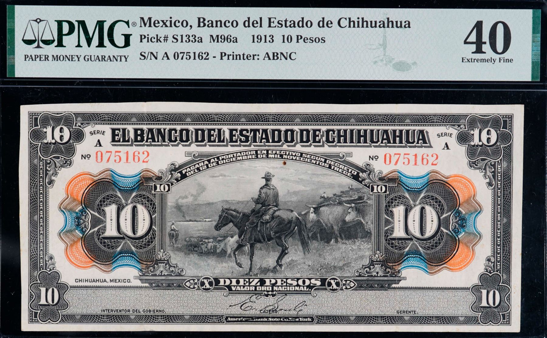 Mexico; 1913 10 Pesos Pick #S100a M96a # A075162 - Printer: ABNC, PMG EF40