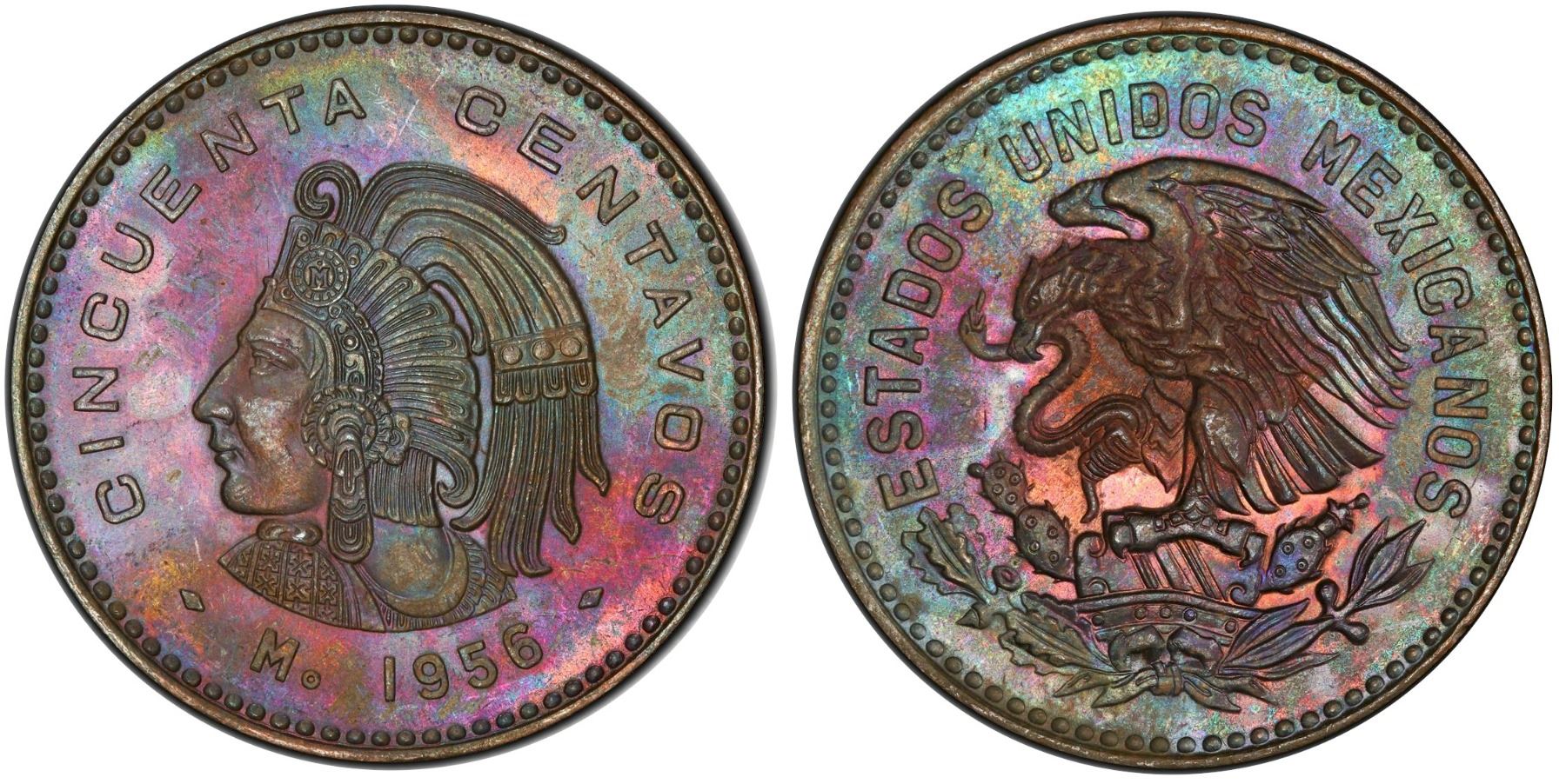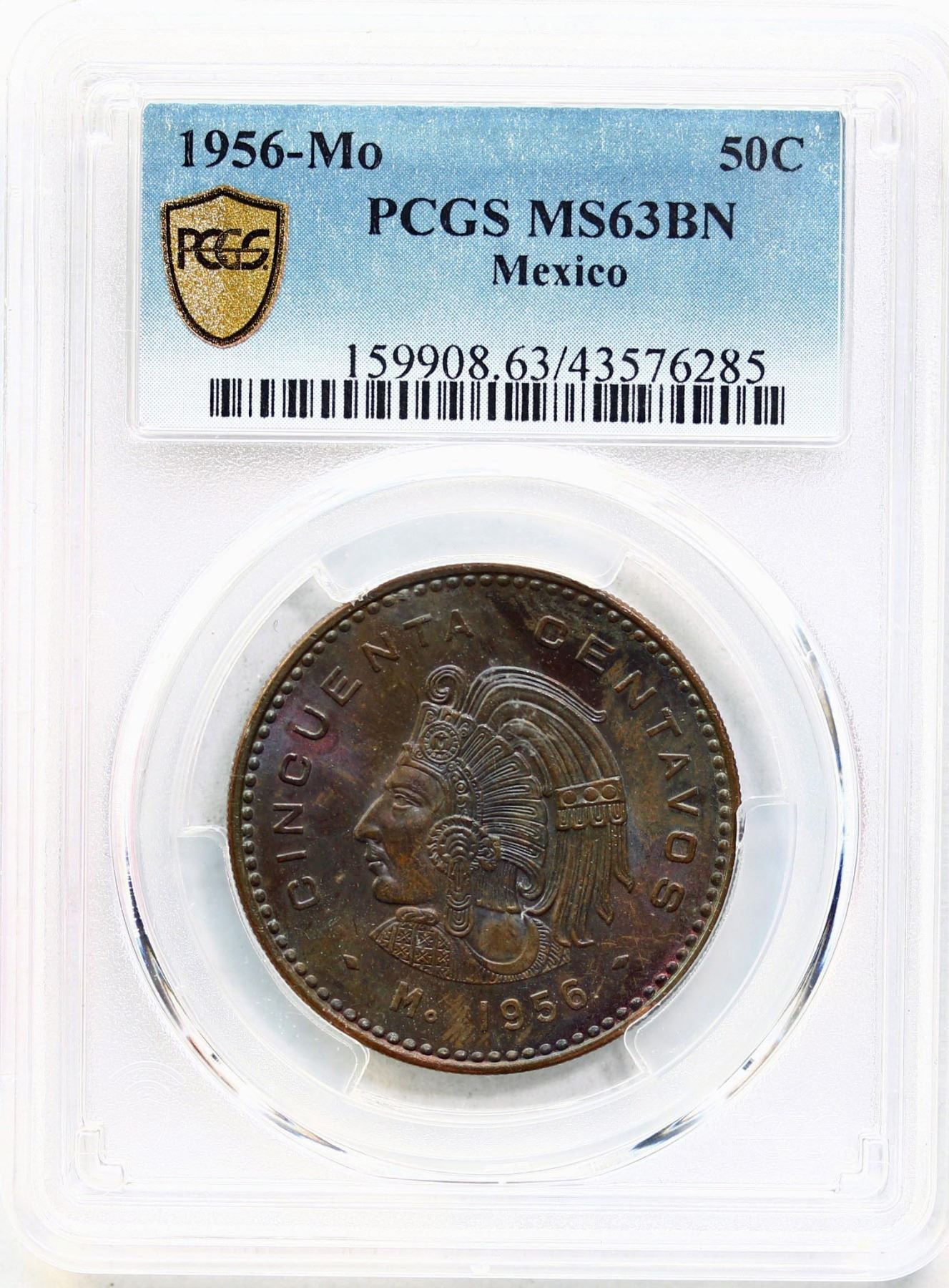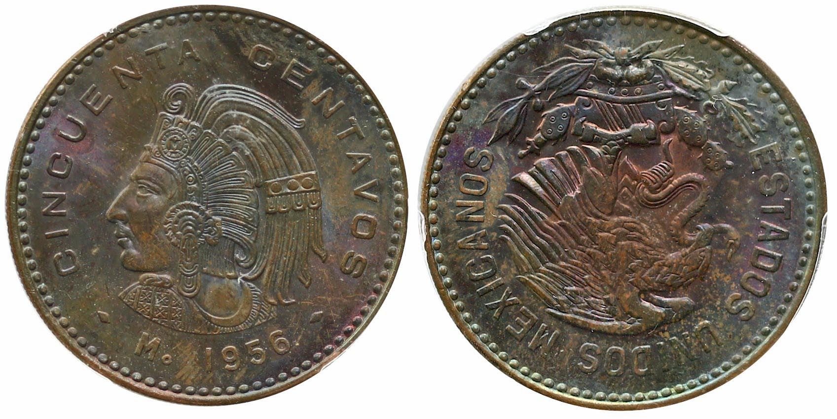 Mexico; 1956-Mo 50¢ PCGS MS63BN. Fully lustrous brown issue.