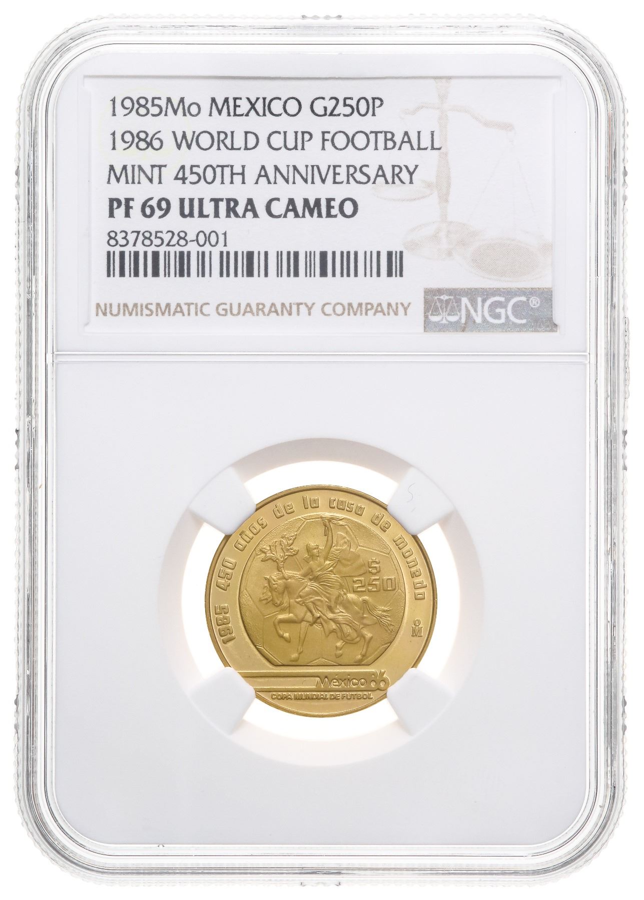 Mexico, 1985, Gold 250 Pesos World Cup Football NGC PF69 Ultra Cameo,