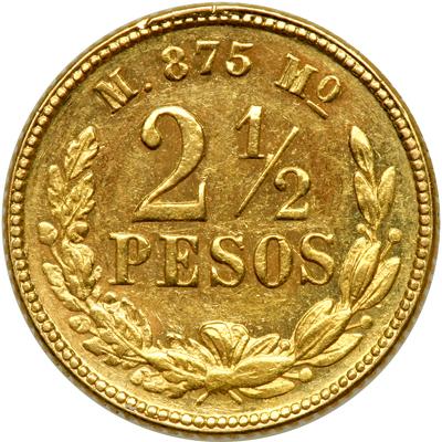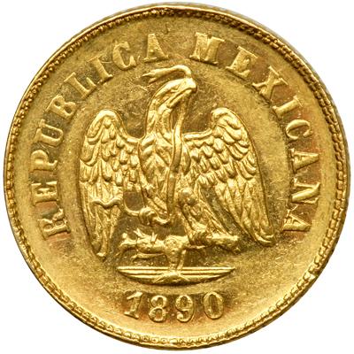 Mexico. 2½ Pesos, 1890-Mo M. Fr-148; KM-411.5. Republic. Eagle. Reverse: Value within wreath. Mintage 420 pieces. Rare date. NGC graded MS-61.