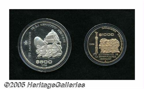 <B>2-piece Proof Set 1985 including:</B></I> silver 500 Pesos, KM511, Anniversary of 1910 Revolution; and a Gold 1000 Pesos, KM513, Anniversary of Independence. Both are Choice Proof in the original case, with certificate.