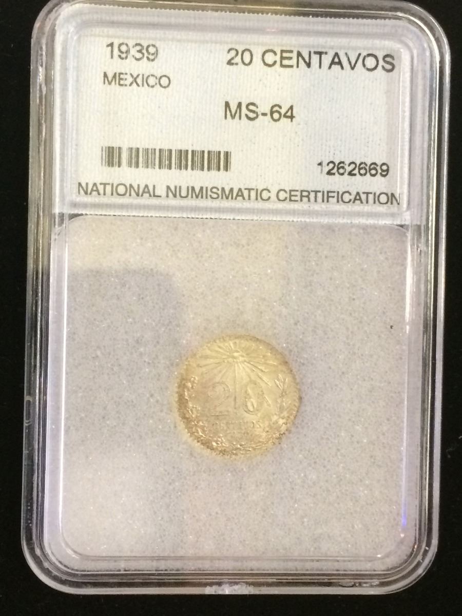 Mexico 20 Centavos 1939; NNC certified MS-64.
