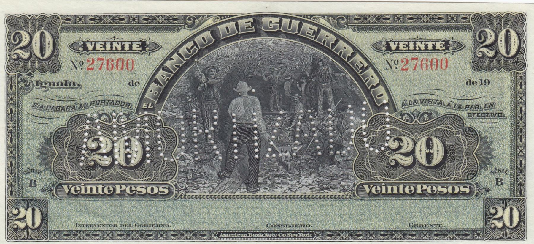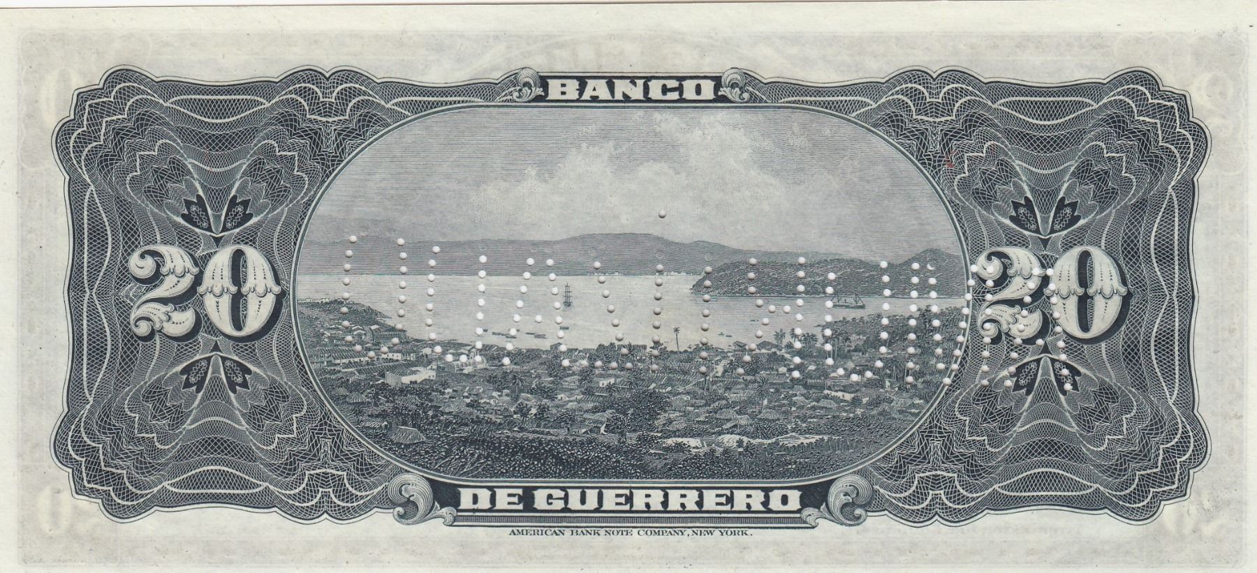 Mexico, 20 Pesos, 1906-1914, UNC, pS300, SPECIMEN br/Banco De Guerrero serial number: B 27600