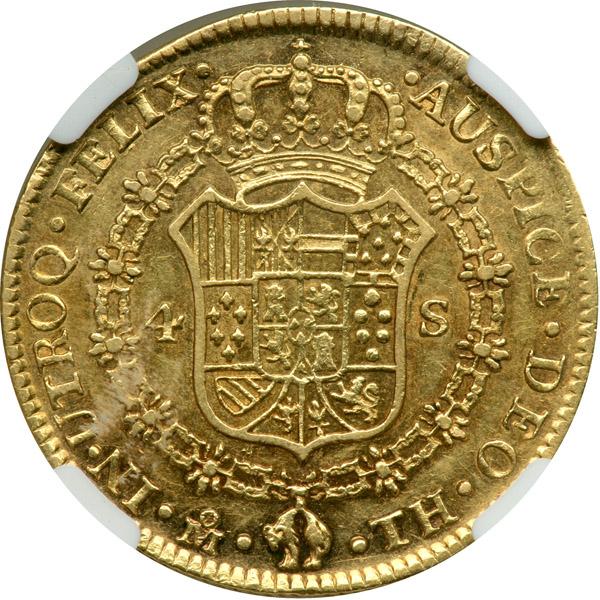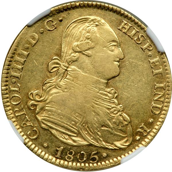 Mexico. 4 Escudos, 1805-Mo TH. Fr-44; KM-144. Charles IV. Official uniformed bust to the right. Reverse: Crowned Hapsburg arms within chain of the Order of the Golden Fleece. Scarce denomination. NGC graded EF-45.