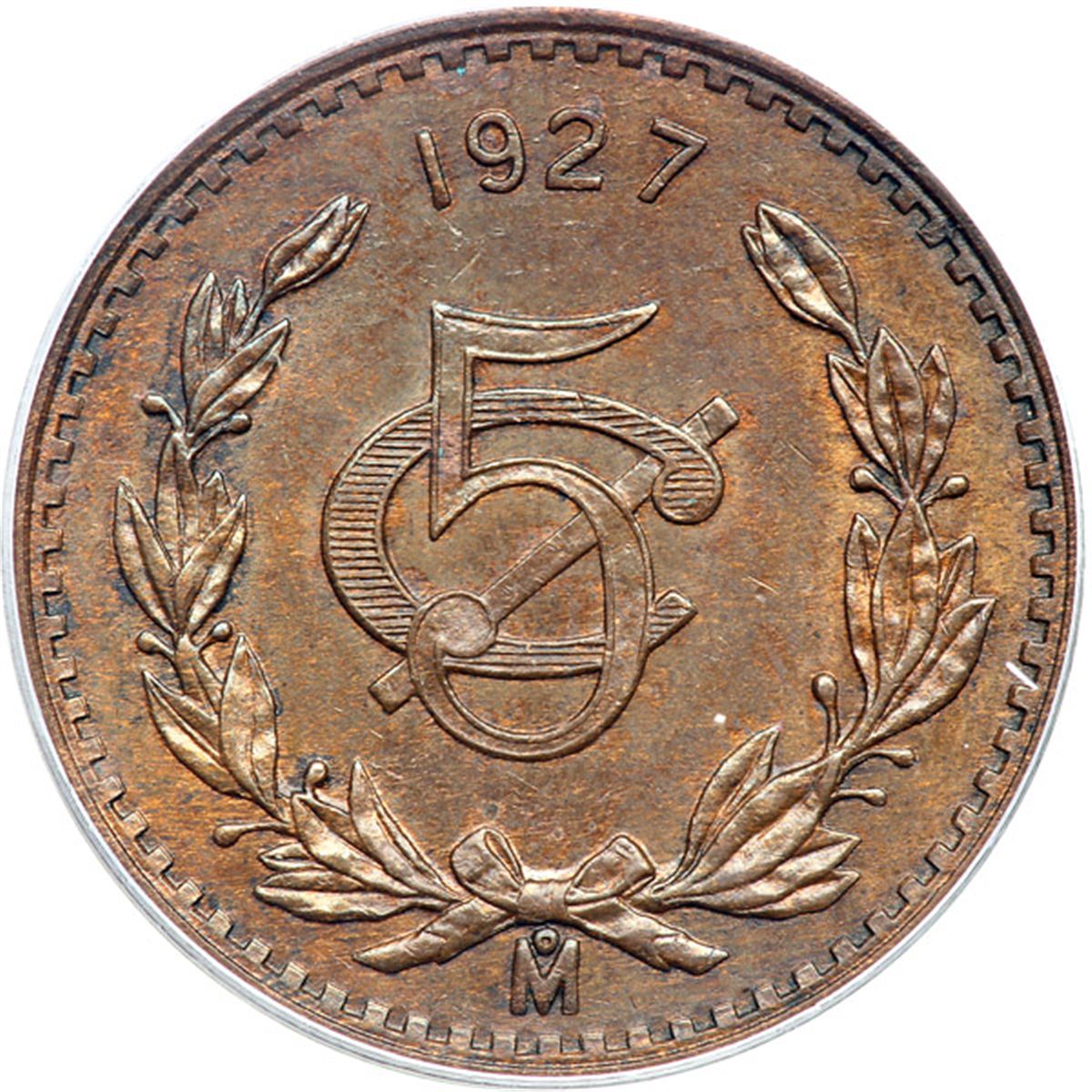 Mexico. 5 Centavos, 1927-Mo. KM-422. PCGS graded MS-62 Brown.