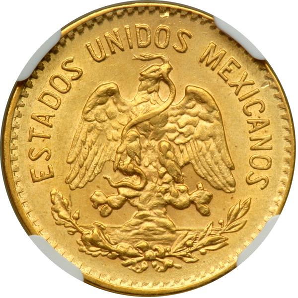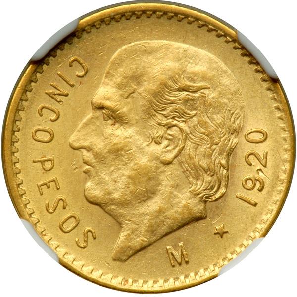 Mexico. 5 Pesos, 1920-M. Fr-168; KM-464. Weight 0.1206 ounce. Head of Hidalgo left. Reverse: Eagle. NGC graded Uncirculated, Details (Surface Hairlines).