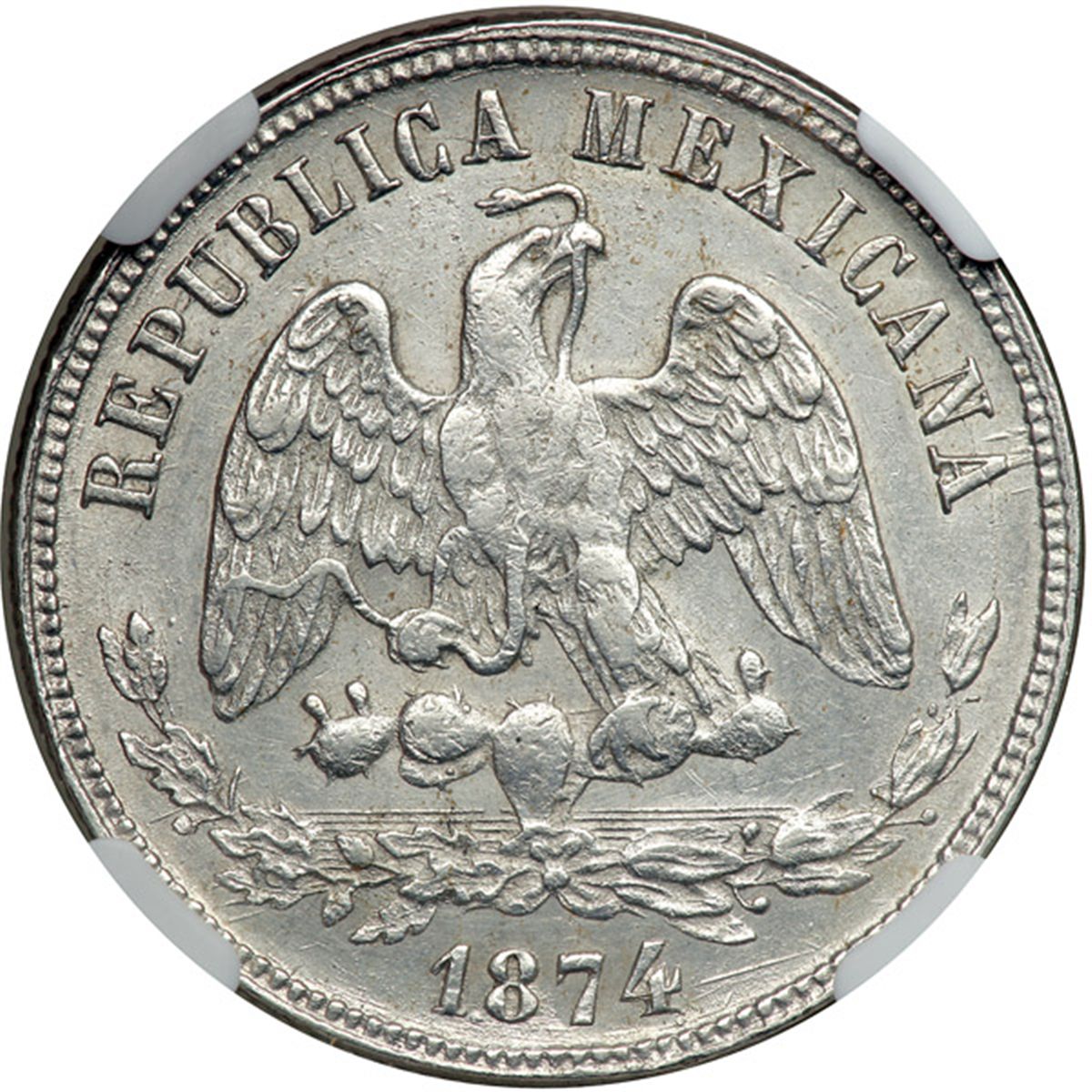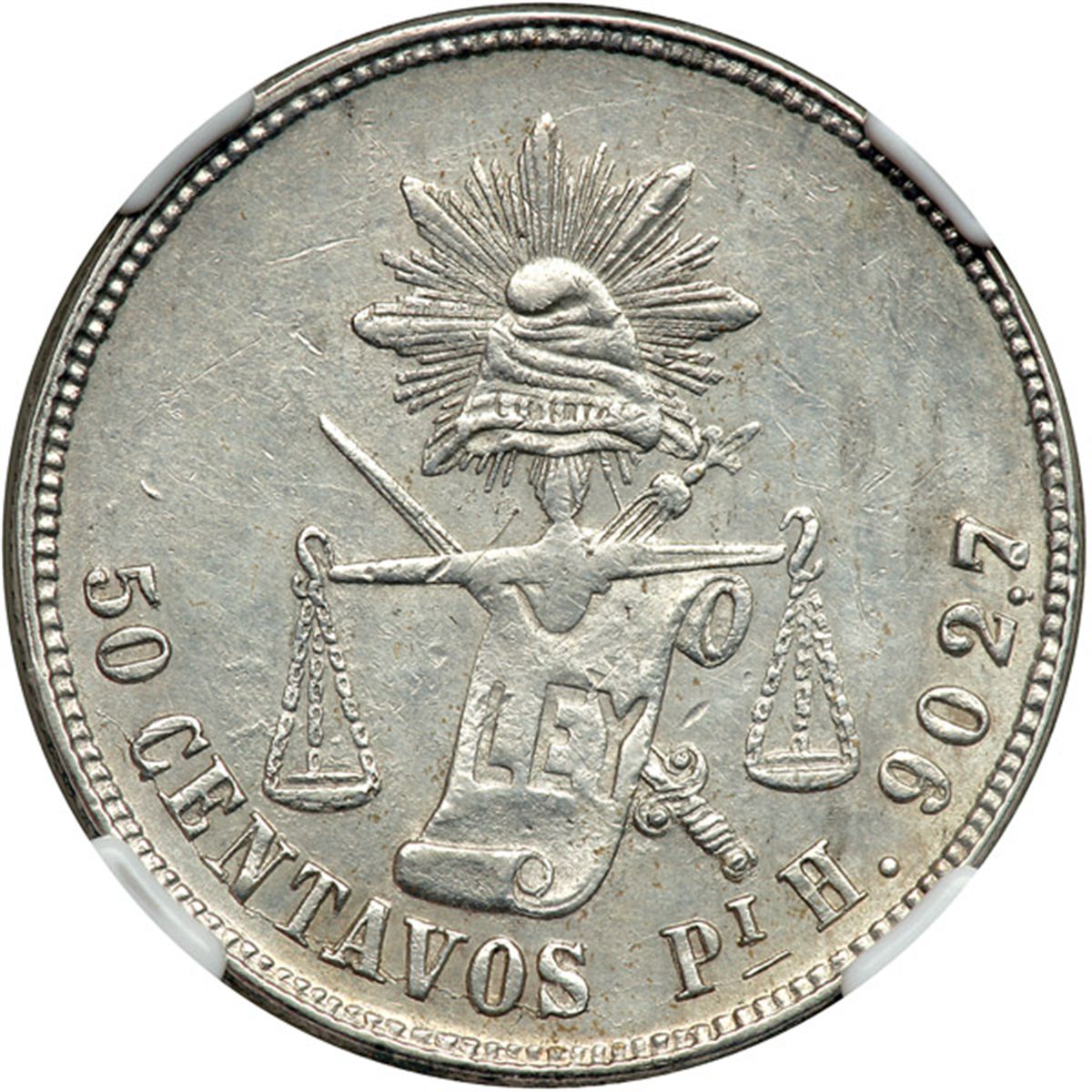 Mexico. 50 Centavos, 1874-Pi H/O. KM-407.7. Balance scale. NGC graded About Uncirculated, Details (Surface Hairlines).