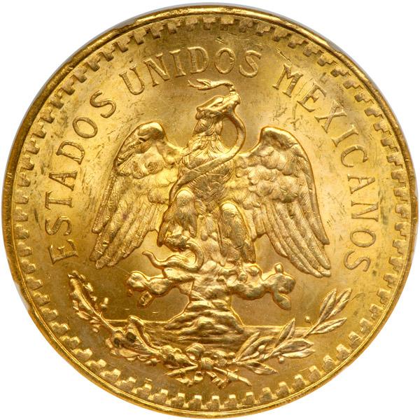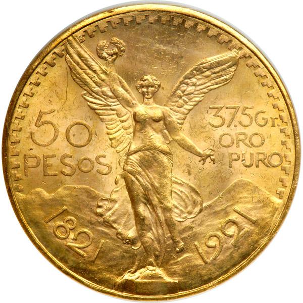 Mexico. 50 Pesos, 1921. Fr-172; KM-481. Weight 1.2056 ounces. Winged Victory, Reverse: Eagle. Rarest date of the series. NGC graded MS-63.