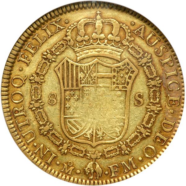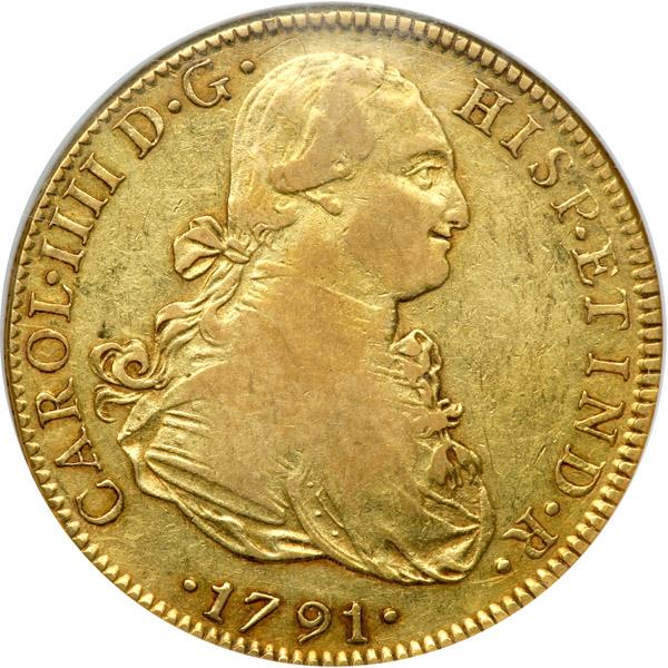 Mexico. 8 Escudos, 1791-Mo FM. Fr-43; KM-159. Charles IV. Softly struck in the centers. Lustrous. NGC graded EF-45.