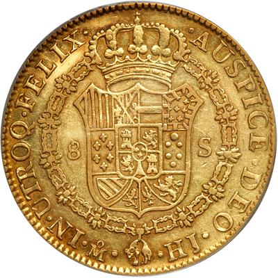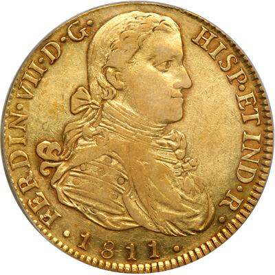 Mexico. 8 Escudos, 1811-Mo HJ. Fr-47; KM-160. Fernando VII. Large armored bust to right. Reverse: Crowned Hapsburg arms within chain of the Order of the Golden Fleece. Mintmark at lower left and assayers' initials at lower right, separated by fleece. PCGS graded EF-40.