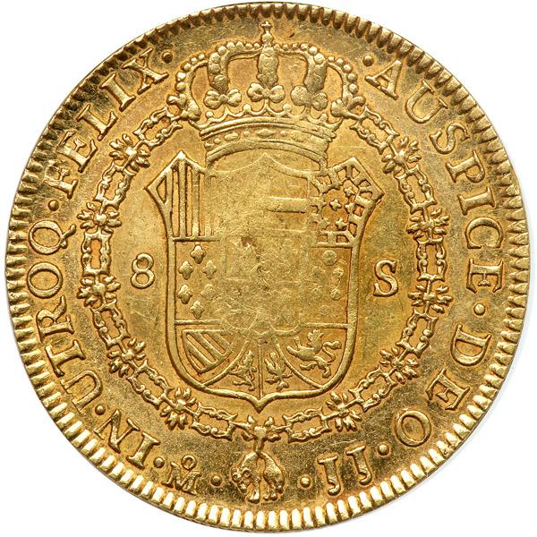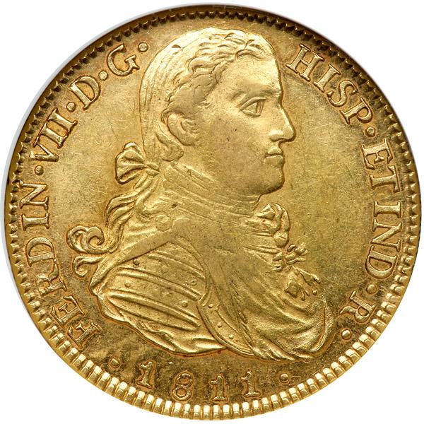 Mexico. 8 Escudos, 1811-Mo JJ. Fr-47; KM-160. Fernando VII. Large armored bust to right. Reverse: Crowned Hapsburg arms within chain of the Order of the Golden Fleece. Mintmark at lower left and assayers initials at lower right, separated by fleece. A very pleasing lustrous example. NGC graded AU-58.
