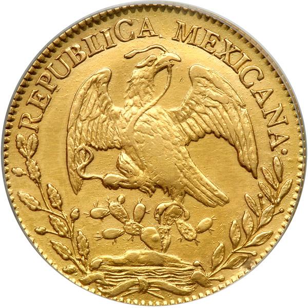 Mexico. 8 Escudos, 1824-Mo JM. Fr-64; KM-383.9. Weight 0.7615 ounce. Republic. First dated 8 escudo for the new hand on book type. Ex Jewelry. PCGS called Genuine, Our grade Very Fine Cleaned.