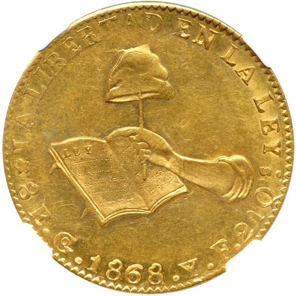 Mexico. 8 Escudos, 1868-Go YF. Fr-72; KM-383.7. Hand on book. Well struck with considerable original mint luster. NGC graded AU-55.