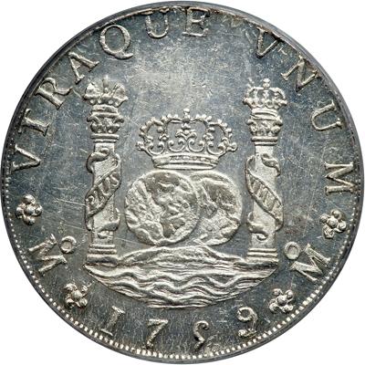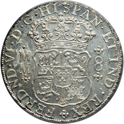 Mexico. 8 Reales, 1759-Mo MM. Eliz-47; KM-104.2. Ferdinand VI, 1746-1759. Pillar coinage, with Imperial Crown on left pillar. Crowned Bourbon arms. Reverse: Crowned globes flanked by crowned and bannered pillars, over water. Pop 2; 4 finer, 3 in 64 and 1 in 66. A nice untoned example. PCGS graded MS-63.