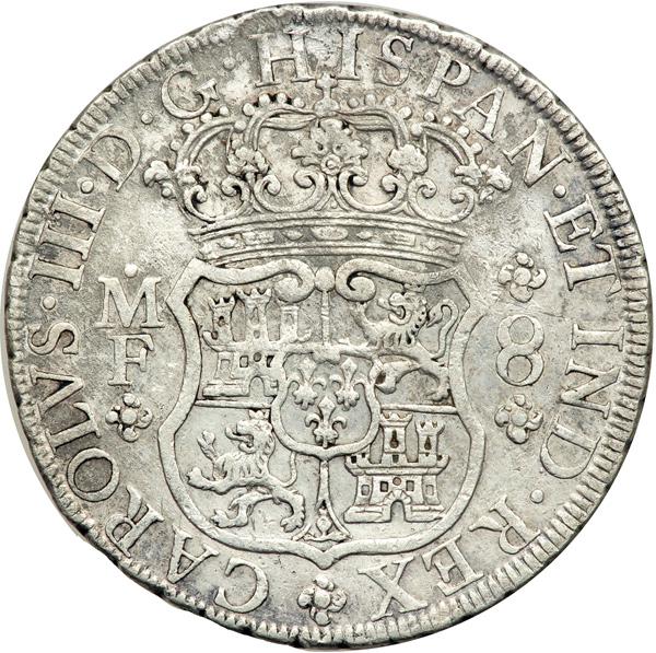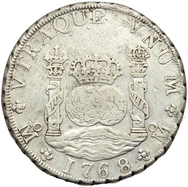 Mexico. 8 Reales, 1768-Mo MF. Eliz-69; KM-105. Charles III. Pillar issue. Lightly cleaned with some surface encrustation. Very Fine.