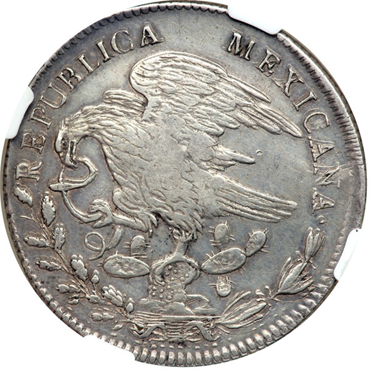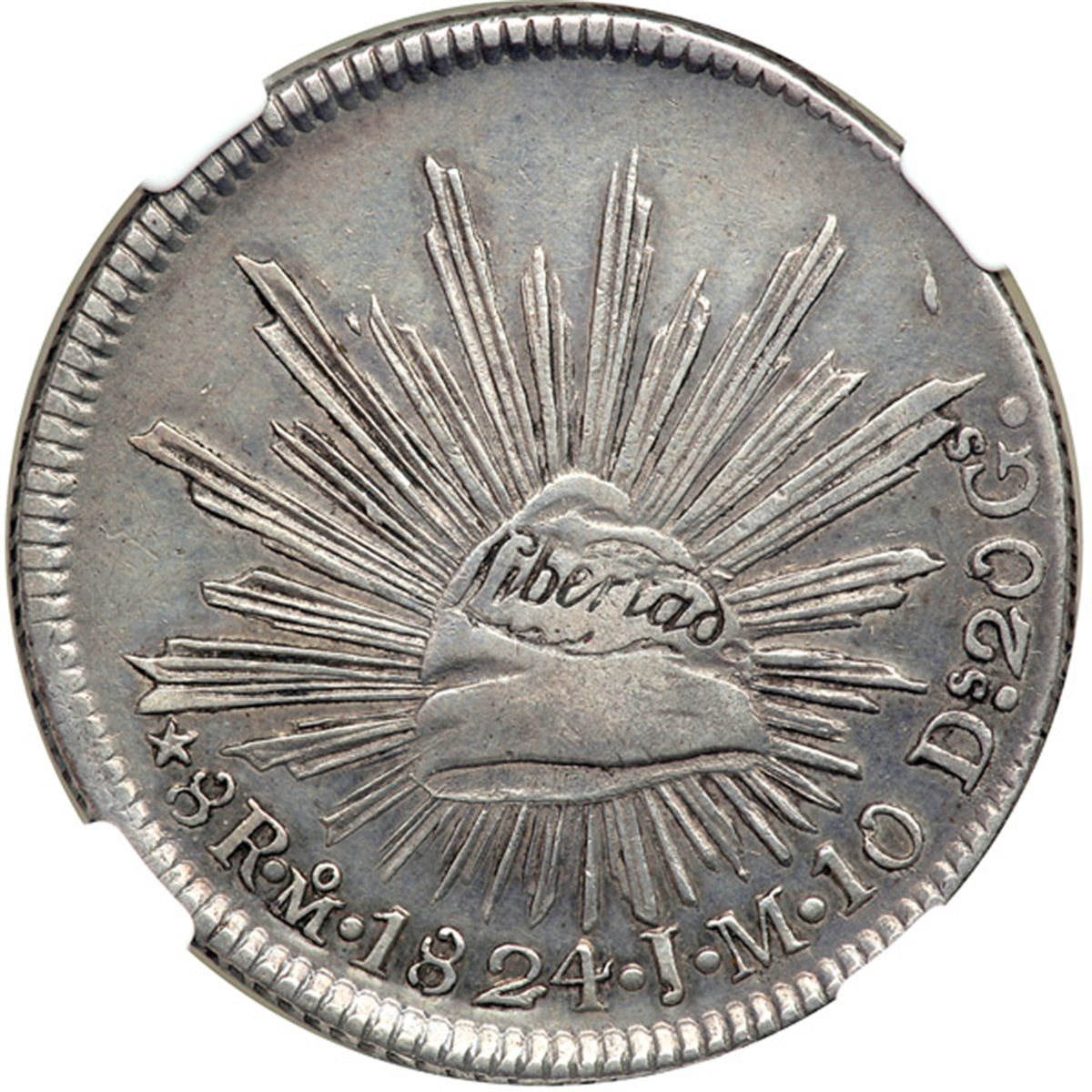 Mexico. 8 Reales, 1824-Mo JM. Eliz-180; KM-A376.2. Republic. Hook-necked eagle facing left holding snake. Reverse: Cap with Libertad surrounded by rays. NGC graded EF-40.