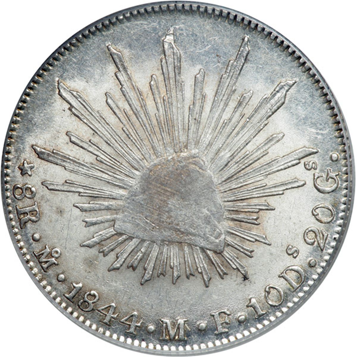 Mexico. 8 Reales, 1844-Mo MF. KM-377.10; Eliz-704. Cap and rays. Softly struck centers. PCGS graded MS-62.