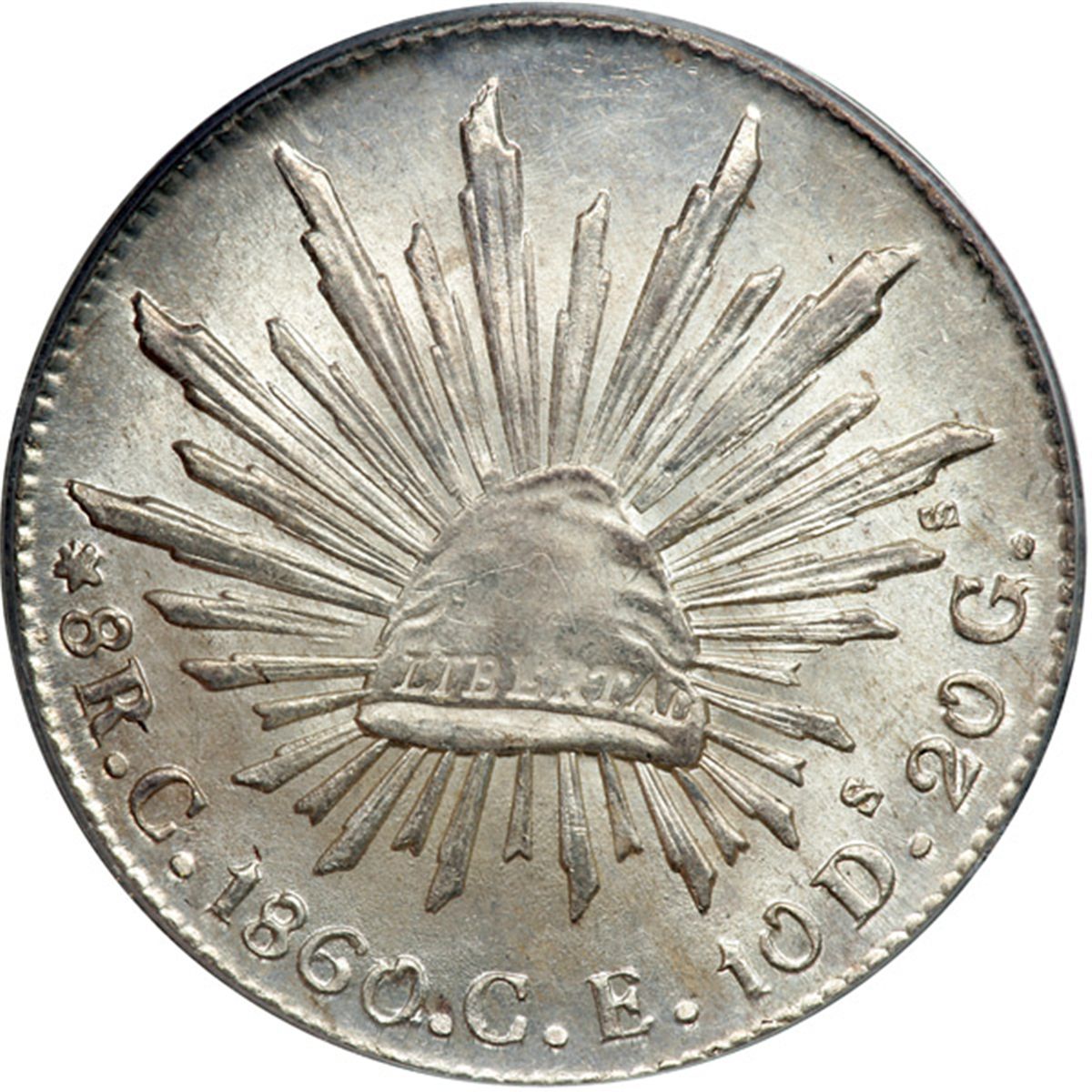 Mexico. 8 Reales, 1860-C CE. KM-377.3; Eliz-314. Cap and rays. PCGS graded MS-63.