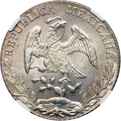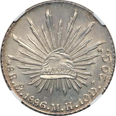 Mexico. 8 Reales, 1886-Mo MH. Eliz-748; KM-377.10; DP-Mo71. Cap and rays. Sharp strike with a tinge of golden tone. NGC graded MS-65.