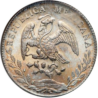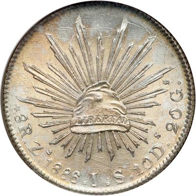 Mexico. 8 Reales, 1886-Zs JS. Eliz-958; KM-377.13. Cap and rays. Lustrous with a light golden-orange tone. NGC graded MS-65.