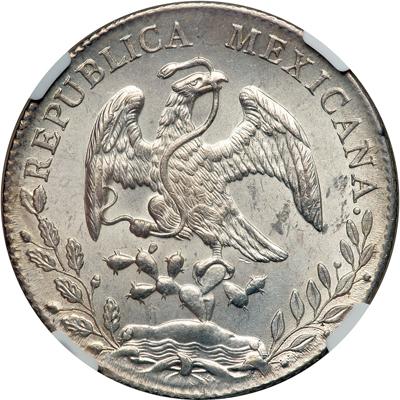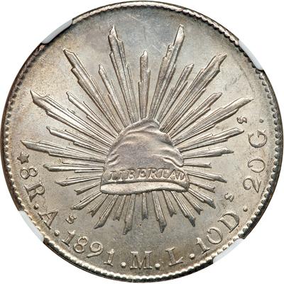 Mexico. 8 Reales, 1891-As ML. Eliz-212; KM-377; DP-As31 (Scarce in Unc.). Cap and rays. NGC graded MS-64.