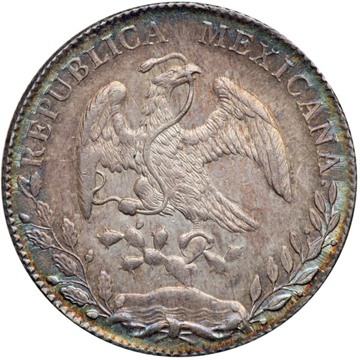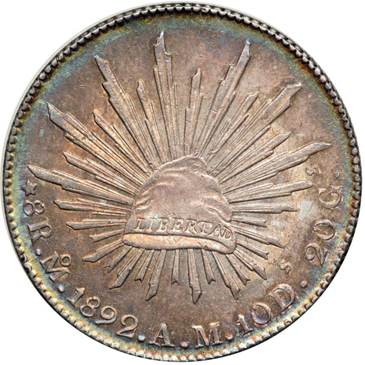 Mexico. 8 Reales, 1892-Mo AM. Eliz-755; KM-377.10. Cap and Rays. Lustrous with beautiful iridescent toning. Almost Uncirculated to Uncirculated.