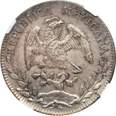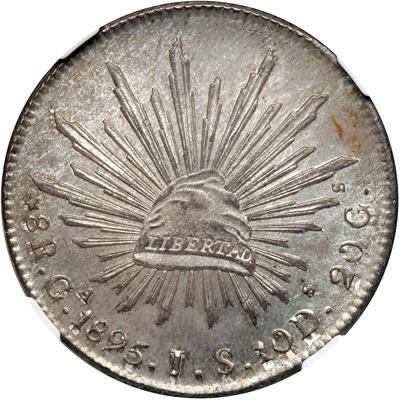 Mexico. 8 Reales, 1895-Ga JS. Eliz-539; KM-377.6; DP-Ga81. Cap and rays. Attractive steel gray tone. NGC graded MS-64.