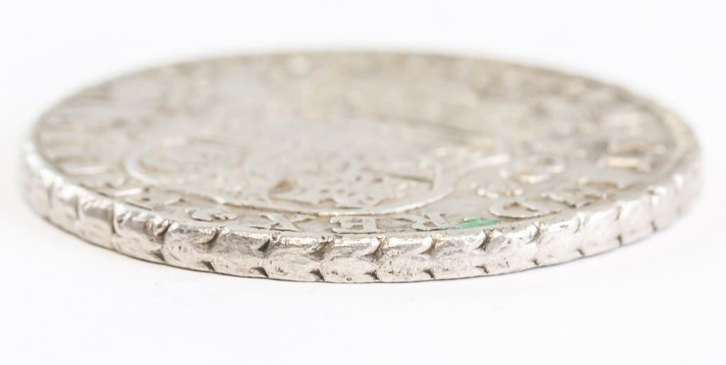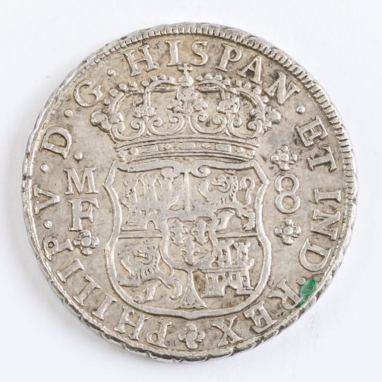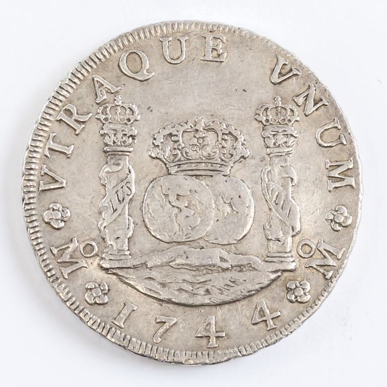 Mexican coin. Obverse: Crowned arms shield flanked by value and initials. PHILIP·V·D·G·HISPAN·ET IND·REX / M F / 8. Reverse: VTRAQUE VNUM PLUS VLTR Mo 1744 Mo. Diameter: 4 cm. 26 grams.