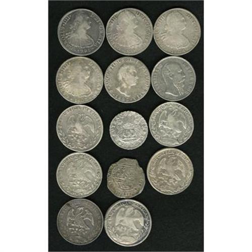 <B>A nice early lot as follows:</B></I> (4) portrait 8 Reales avg VF 1795, 1795, 1804, 1803; pillar 4 Reales 1742/1, sea-salvage VF details heavy corrosion; Philip II cob 4 Reales O Assayer VF; Iturbide 8 Reales 1823 JMF-VF; Maximilian Peso 1866 MoF-VF details cleaned with rim damage; (6) Cap and Rays Pesos, some slightly better dates, VF to XF 1827, 1841, 1842, 1843, 1844, 1878.<BR><BR><b>Shipping:</b> Coins & Currency (<a target="_blank" href="http://www.heritageauctions.com/common/shipping.php">view shipping information</a>)