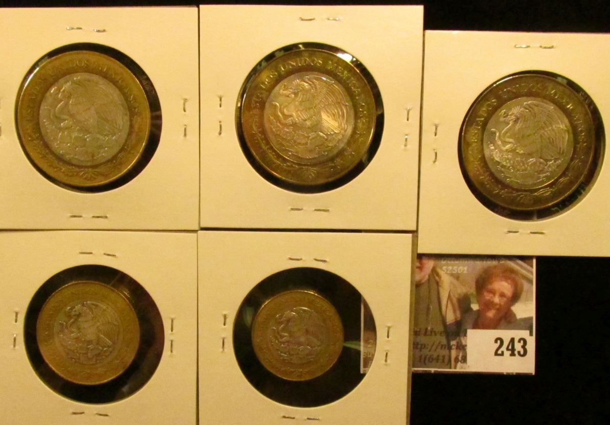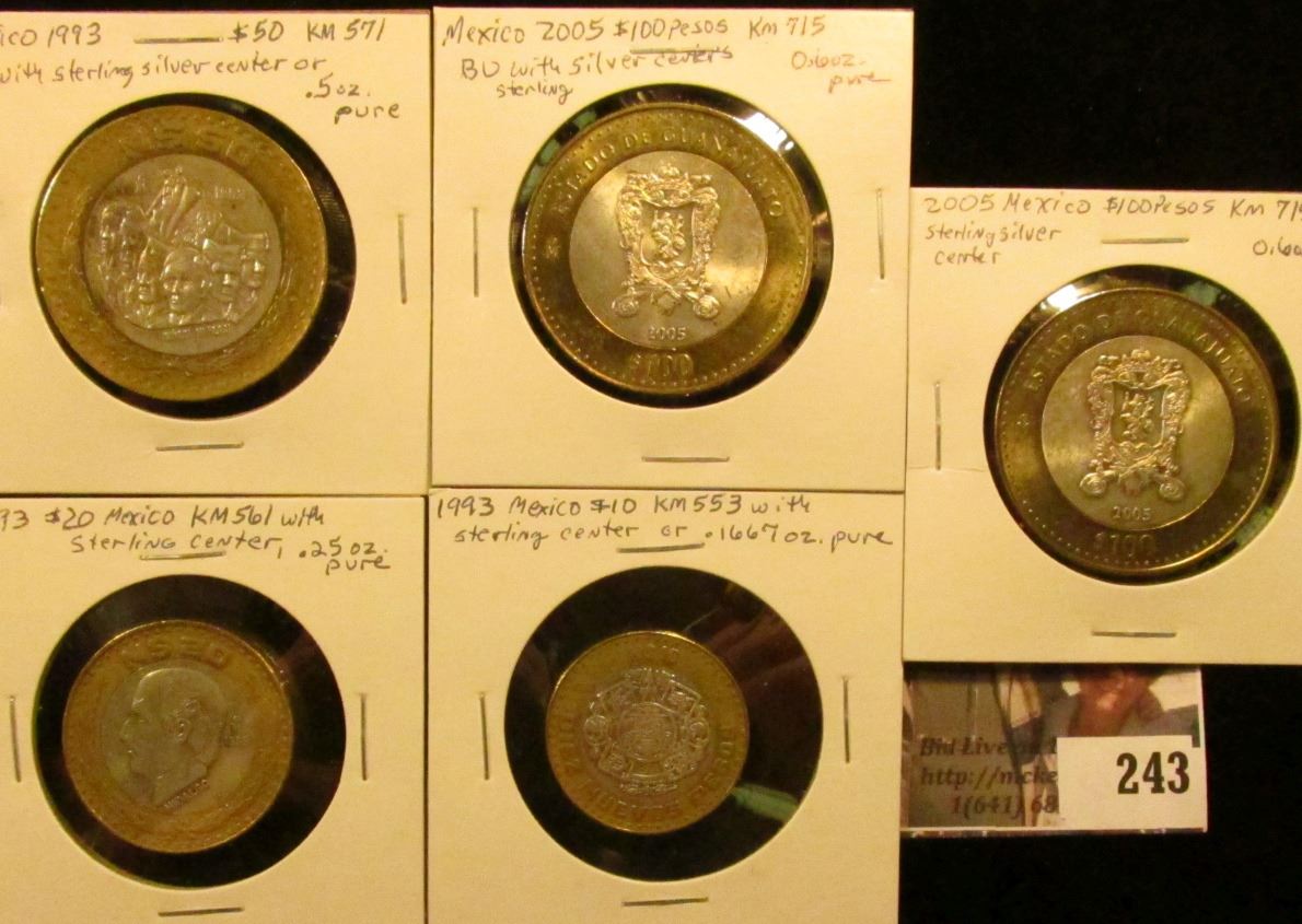 Mexico Assortment Sterling Silver Centers $10, $20, $50, & $100 Pesos. Five Coins with total silver