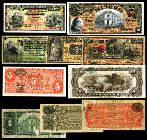 Mexico, Lot of 5 notes, Includes Banco Minero (2), 1914, 1 Peso, P-S162d, VG-Fine; 10 Pesos, P-164AxChoice VF to almost XF; Banco Durango, 1910, P-S273c, Fine; Banco Peninsular Mexicano(2), 1914, 5 Pesos, P-S465a, CU to Gem Unc. and 1 Pesos, 1913, P-S464b, Choice VF. Attractive Mexican assortment.